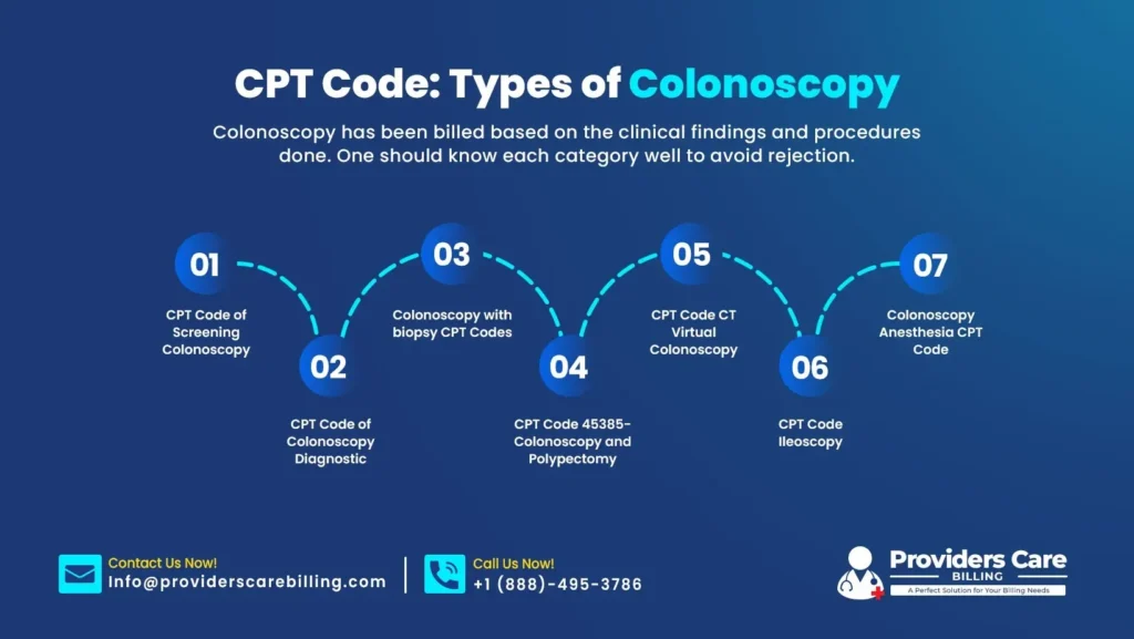 In case you are in doubt about what the CPT code for colonoscopy is, it will depend on the type of procedure that you are undergoing, particularly in relation to colorectal cancer screening. Colonoscopy is not billed under a single code, but rather under different types of CPT codes based on the type of procedure performed like screening, diagnosis or other forms of intervention like biopsy or polyp removal.